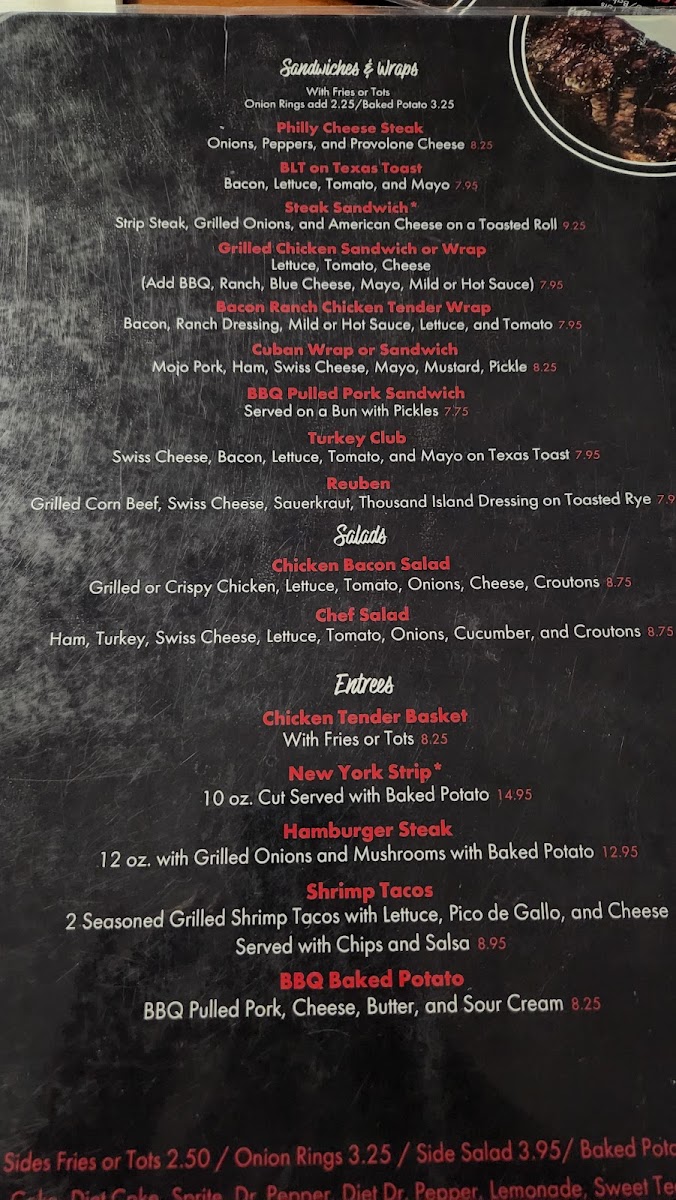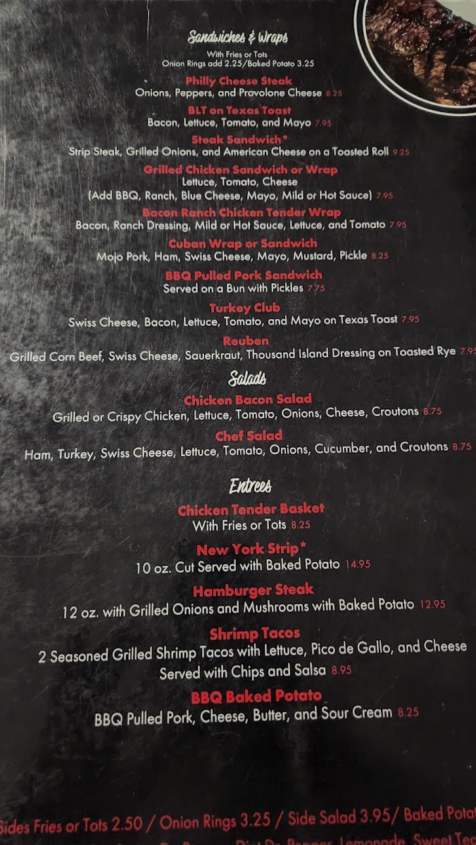 For lighter bites, salads like the Grilled Chicken Caesar and the Chicken Bacon Salad offer fresh, crisp options balanced with savory elements. Starters such as fried pickles, loaded bacon cheese fries, and mozzarella sticks set the stage for robust flavors that satisfy every craving.